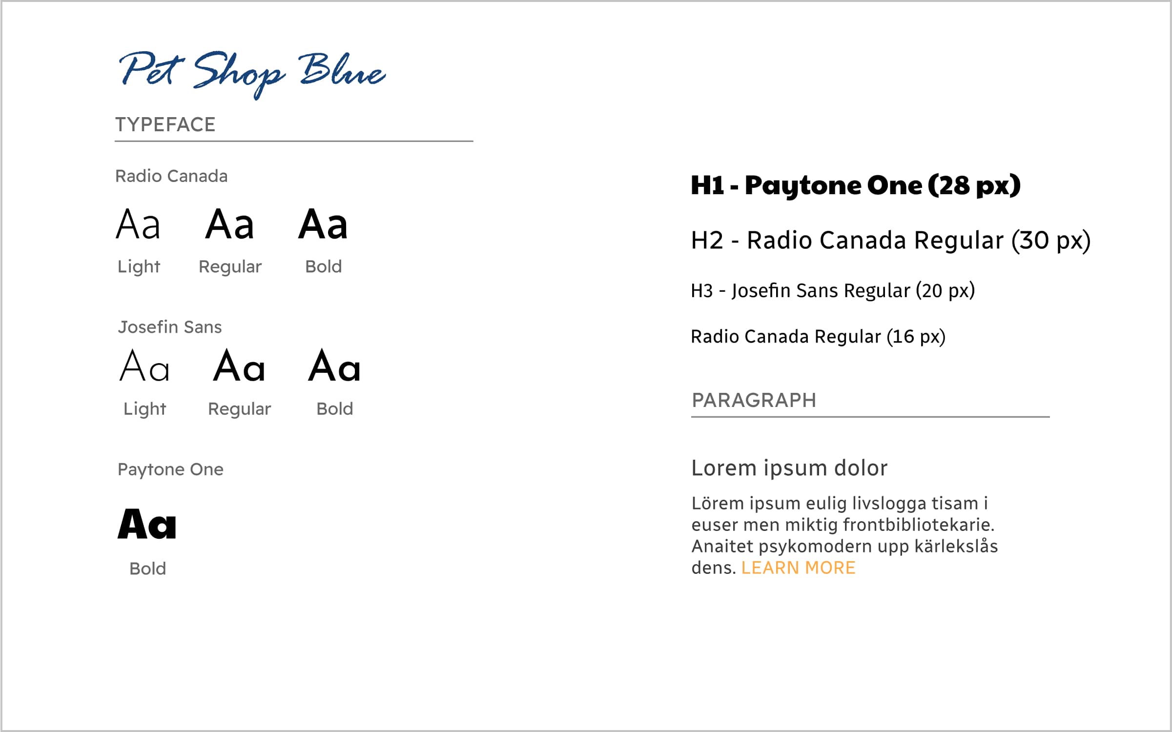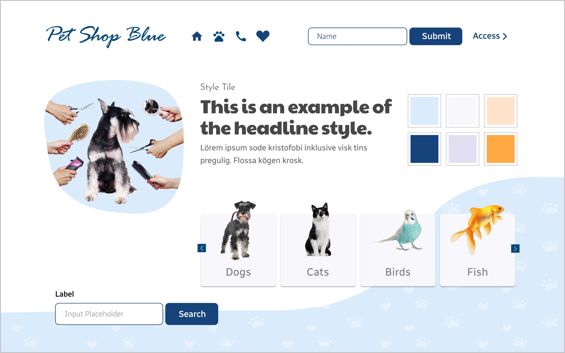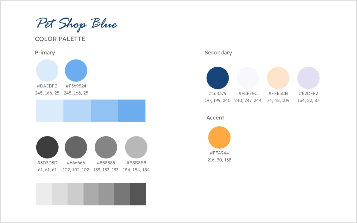 Pet Shop Blue naturally called for shades of blue as the primary color across backgrounds and visual elements. Orange was chosen as the complementary accent to bring warmth and energy to the design — the two hues make each other appear more vibrant while blending into effective neutral tones for shadows.
